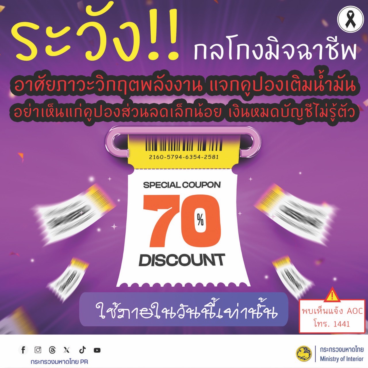 มิจฉาชีพอาศัยกระแสวิกฤตพลังงาน หลอกแจกคูปองส่วนลดน้ำมันพร้อมลิงก์ให้กดรับสิทธิ์ หรือกรอกข้อมูลส่วนตัว สุดท้ายถูกดูดเงินหรือขโมยข้อมูลโดยไม่รู้ตัว